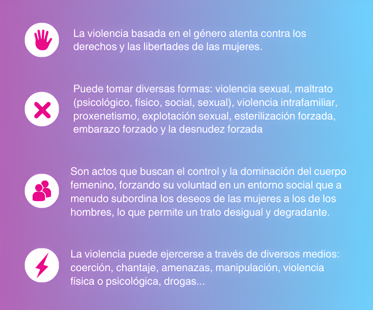 Abarca todas aquellas formas de violencia que se dirigen a las mujeres, tanto en el ámbito público como en el privado. Puede darse en los espacios políticos, institucionales, laborales, la violencia sexual, la segregación y el maltrato (físico, psicológico, social, sexual)
